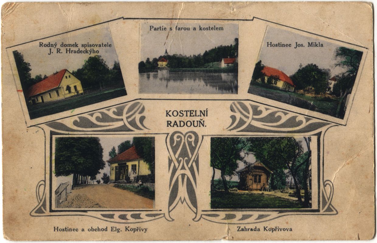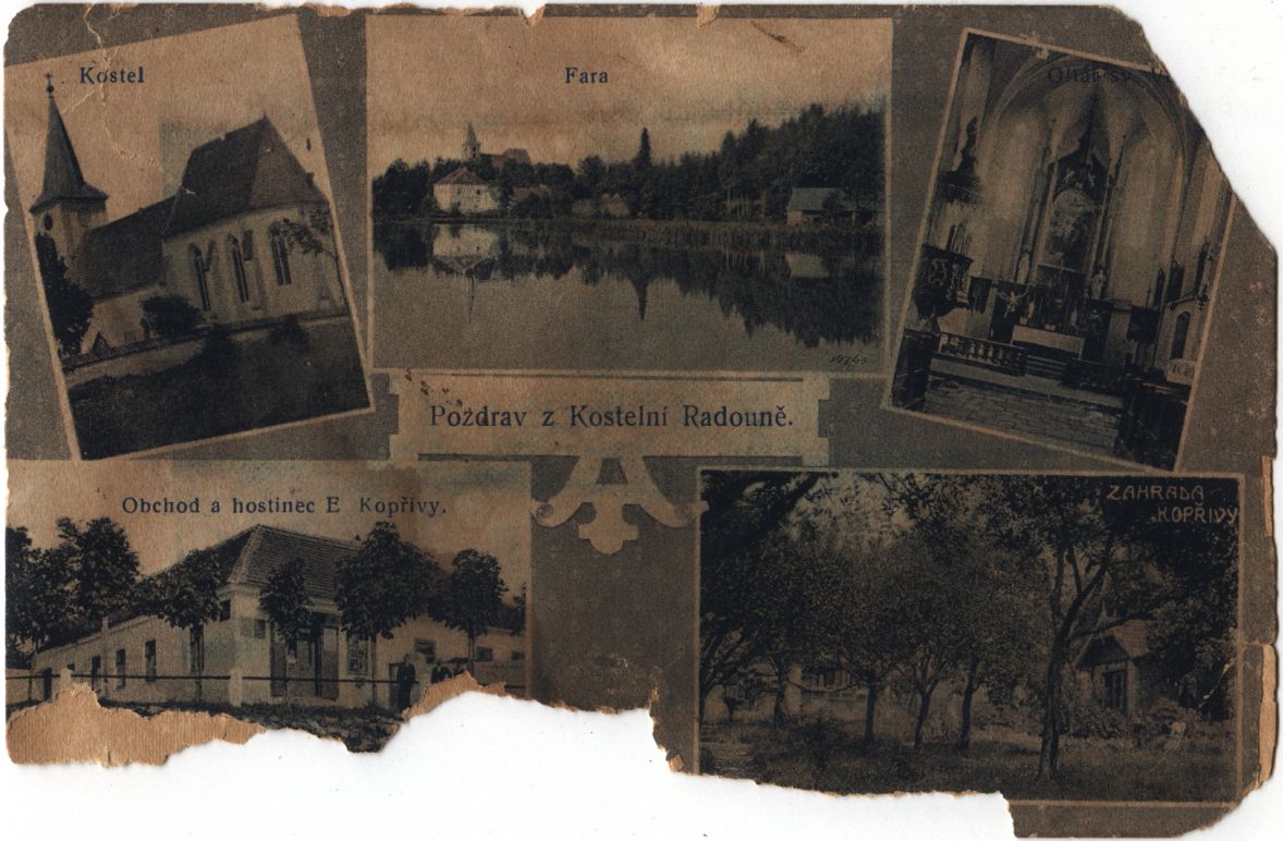 Pro zachování autenticity vyprávění jsem textu ponechal hovorovou formu – jde o přepis rozhovoru z roku 2007 nahraného na mikrofon, ze kterého jsou vypuštěny mé otázky. Téhož roku jsem text opatřený fotografiemi publikoval jako přílohu výroční zprávy (dnes již zaniklého) občanského sdružení Pro Radouň. V roce 2020 jsem tuto mozaiku výrazně redigoval, bloky přeskládal s ohledem na časovou linku a publikoval zde. Pramenem pro poznámky mi byla publikace 700 let Kostelní Radouně, kterou vydal OÚ K. Radouň v roce 1996. Dopisnice vydané nákladem Elegia Kopřivy poskytla k oskenování Alena Sedláková.